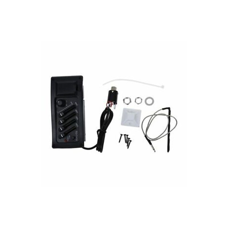Guitar Preamp Amplifier equalizer EQ 4-Band EQ Preamp Acoustic Piezo 7545r Product Description Introduction: Under the saddle pickup for acoustic guitar Pre-wired for easy assembly 4 bands plus volume control Supplied with a battery box, Low battery indicator. Connecting wire with 2.5mm plug included Specifications: Presence Control: ± 12dB at 8KHz Bass Control: ± 12dB at 600Hz Middle Control: ± 12dB at 600Hz Pickup dimensions: 10.5 (L) x 4.7 (W) x 6 (H) cm (4 x 1.9 x 2.4inches) Frequency Response: 20Hz - 20KHz Power: 9V alkaline battery Treble Control : ± 12dB at 2.2KHz Package Includes: 1 x Pre-Amp plus pickup 1 x Connecting wire with 2.5mm plug 1 x 9 Volt battery 1 x Mounting base with sticker 4 x Mounting screwsNote:Light shooting...