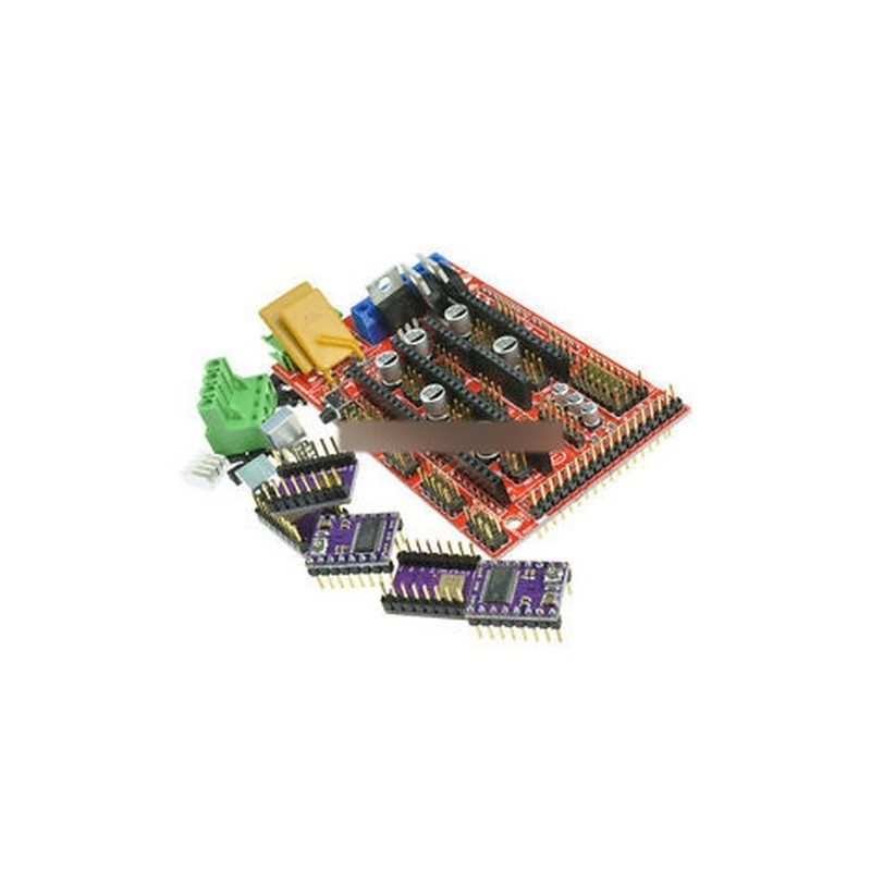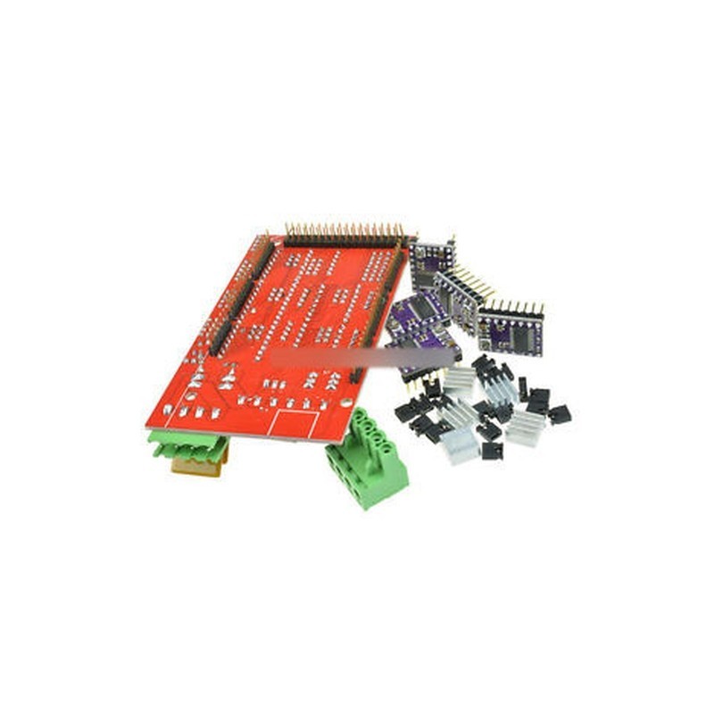 RAMPS 1.4 Controller Board 5PCS DRV8825 StepStick Driver Module For 3D PrinterThe RAMPS 1.4 board is designed to fit the entire electronics needed for a RepRap in one small package for low cost. RAMPS interfaces an Arduino Mega with the powerful Arduino MEGA platform and has plenty room for expansion. The modular design includes plug in stepper drivers and extruder control electronics on an Arduino MEGA shield for easy service, part replacement, upgrade-ability and expansion. Additionally, a number of Arduino expansion boards can be added to the system as long as the main RAMPS board is kept to the top of the stack.The DRV8825 stepper motor driver carrier is a breakout board for TI’s DRV8825 microstepping bipolar stepper motor driver. The module has a pinout and interface that are nearly identical to those of our A4988 stepper motor driver carriers, so it can be used as a higher-performance drop-in replacement for those boards in many applications.The DRV8825 features adjustable current limiting, overcurrent and overtemperature protection, and six microstep resolutions (down to 1/32-step). It operates from 8.2 – 45 V and can deliver up to approximately 1.5 A per phase without a heat sink or forced air flow (rated for up to 2.2 A per coil with sufficient additional cooling).