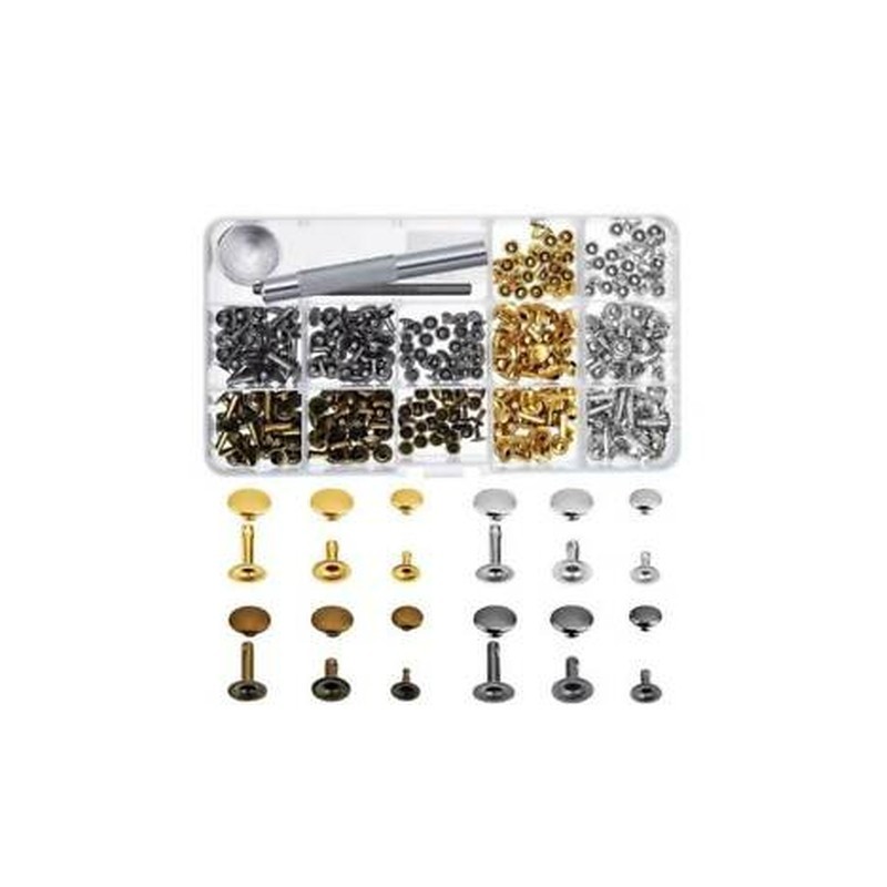 A csomag tartalma: 5 x 45db Bronz színű szegecs, 5 x 45db Ezüst színű szegecs, 5 x 45db Arany színű szegecs, 5 x 45db Fém (fegyver) színű szegecs, 5 x 3db Rögzítő eszköz, 5 x 1db Tároló doboz (5 szett)