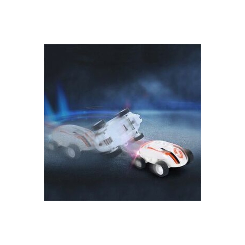 3. Single car spin: Firstly, turn the car upside down and turn on the switch, use hand to rotate it. The car will rotate rapidly like a shining spinner.4. Fixed-point spin: Connect the pen and car by rope and use the pen as a fixed point. The car will rotate with the pen. Just like racing in an annular runway.