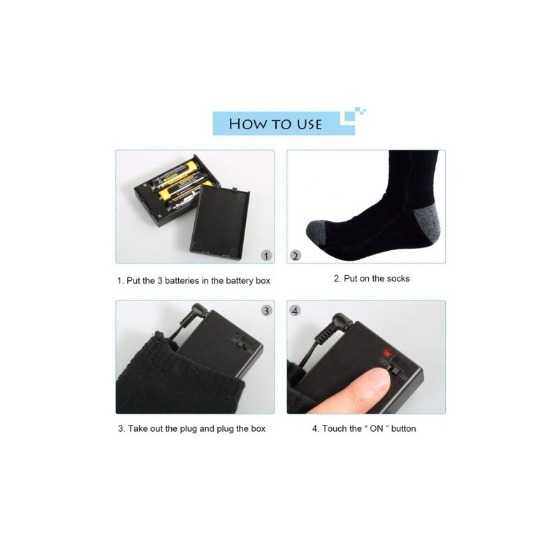 NO MORE COLD FEET: The unisex thermal elastic socks are made out of Cotton material that absorbs sweat and offer breathability and use ultra-thin carbon heating element. Socks stay warm for up to 5 hours, and require 3x AA batteries each(not included). One can use alkaline or rechargeable batteries too.