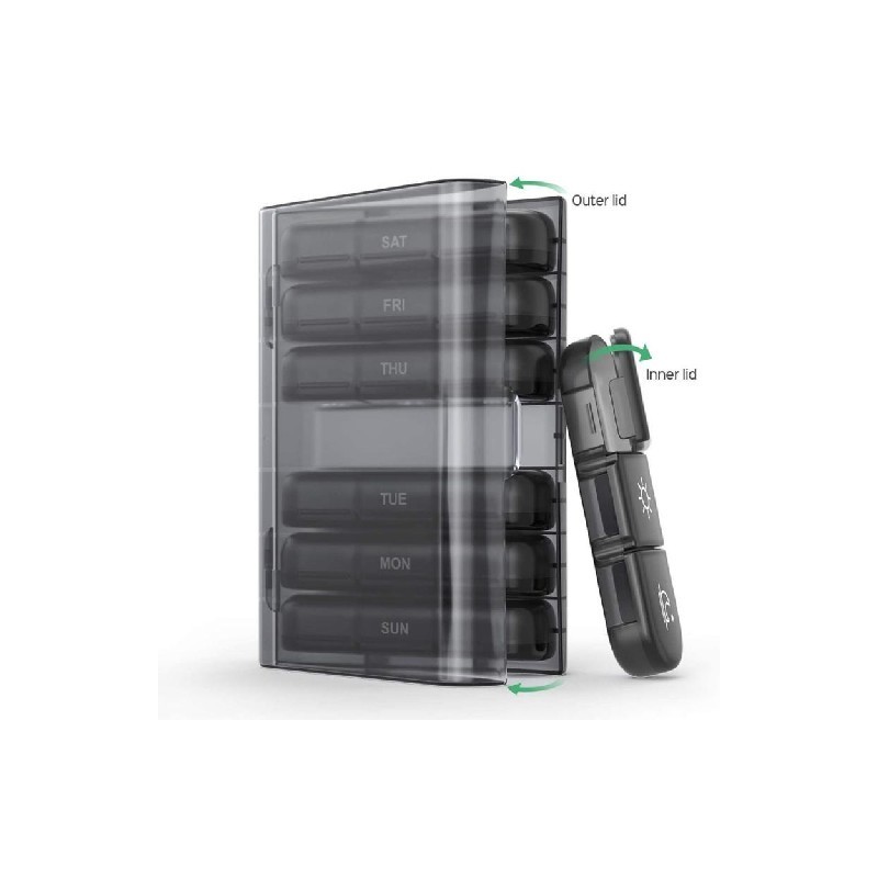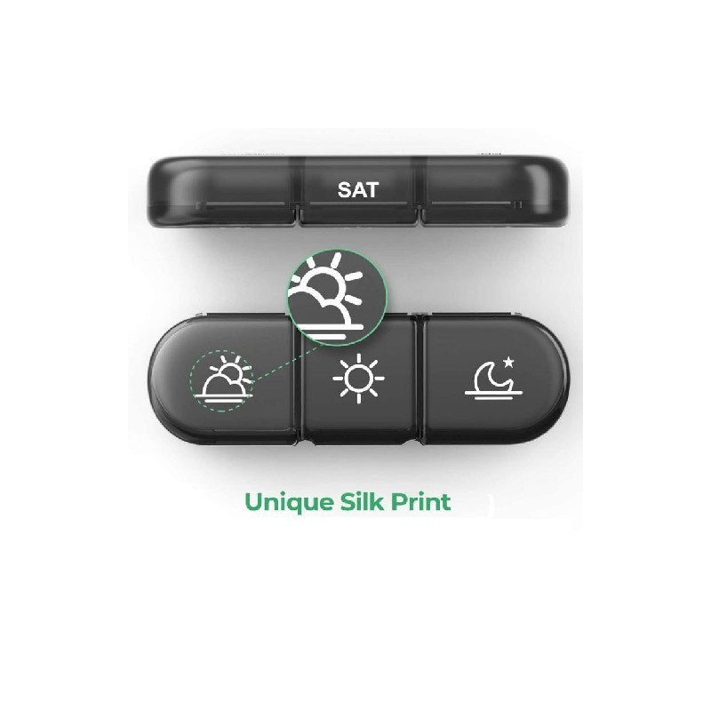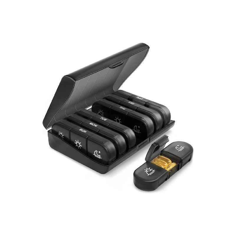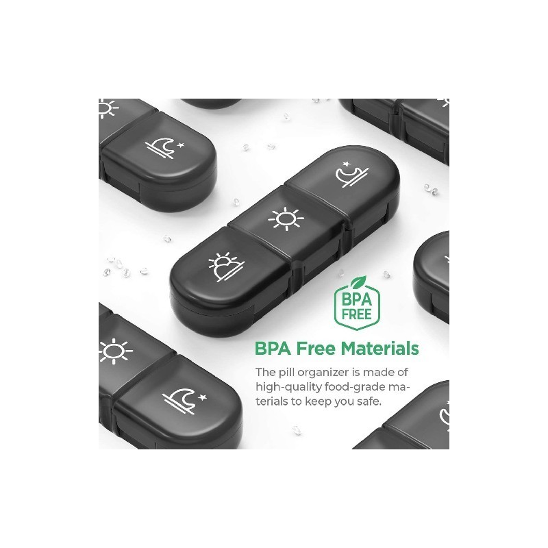 Follow the medicine: tablet containers (morning, noon and evening) three times a day; The largest black shell can accommodate 7 independent pill box organizers to plan pills for a week.