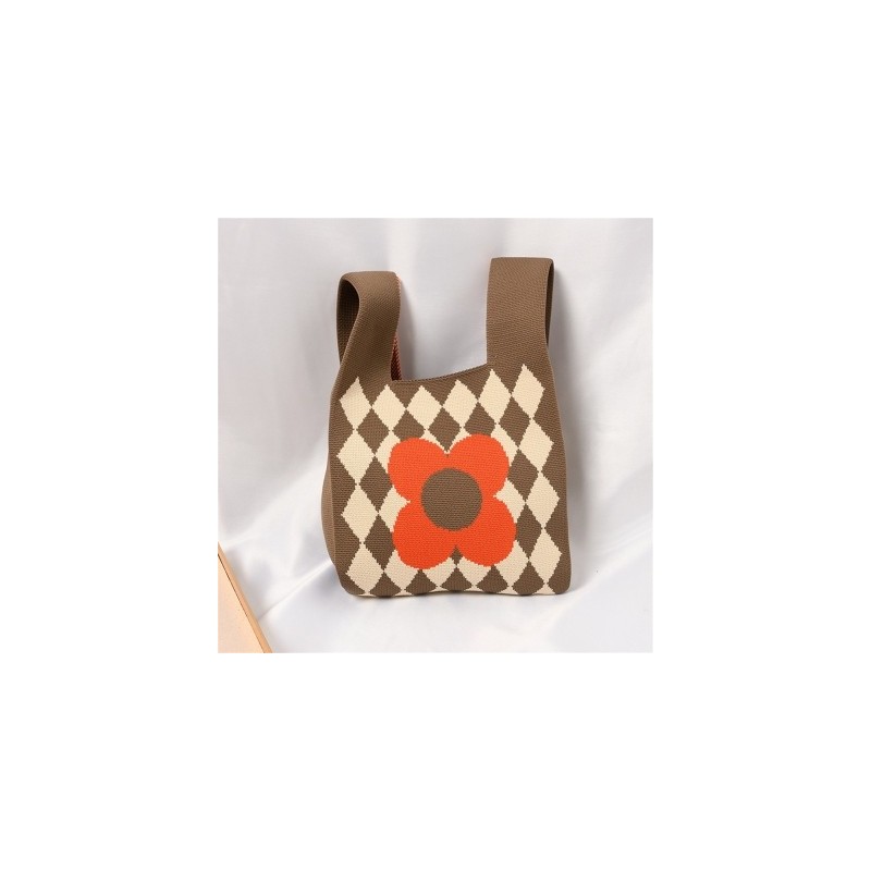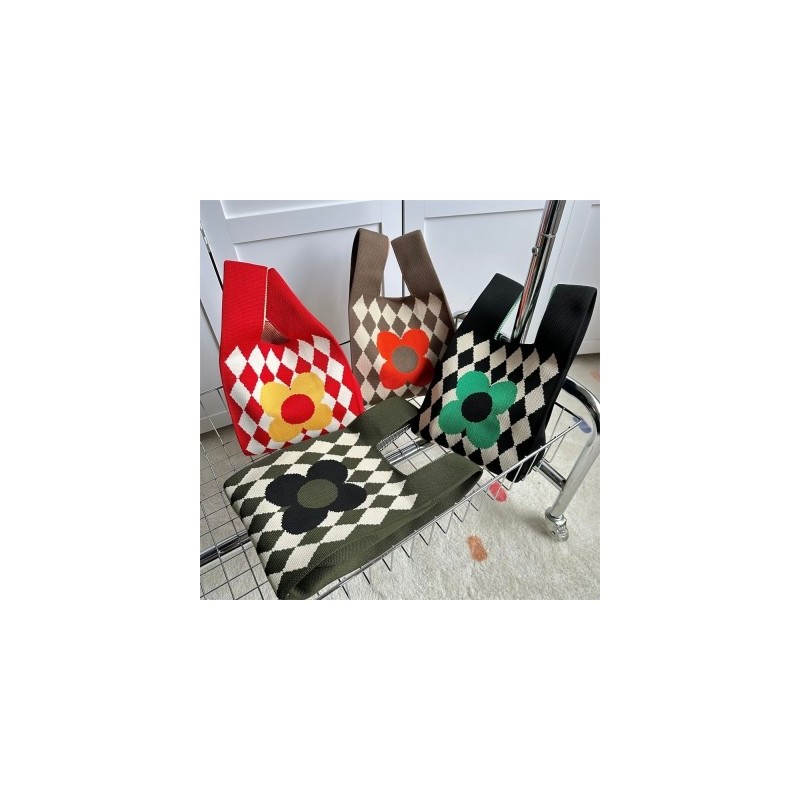 Geometric Flower Knit Handbag Women Korean Casual Plaid Wrist Bag Foldable Eco Shopping Bag Reusable Grocery Storage Tote Bag