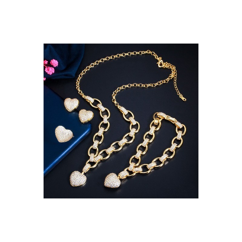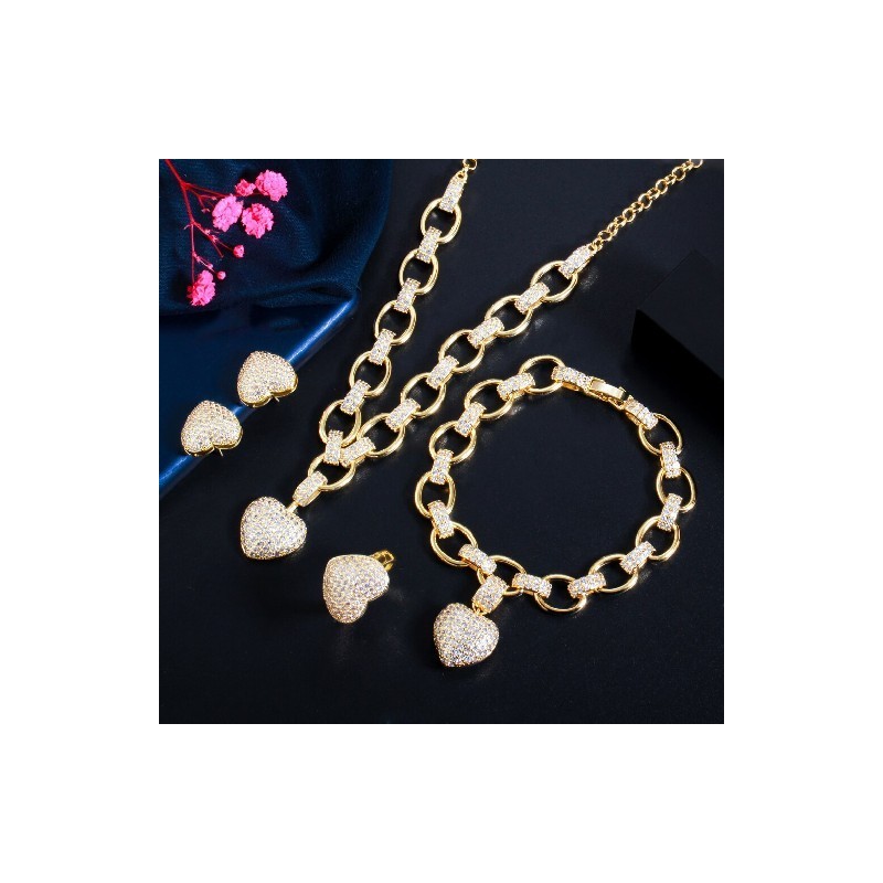CWWZircons 4 Pcs Cuban Link Chain Love Heart Gold Color CZ Necklace Earring Bracelet Ring Women Party Costume Jewellery Set T517