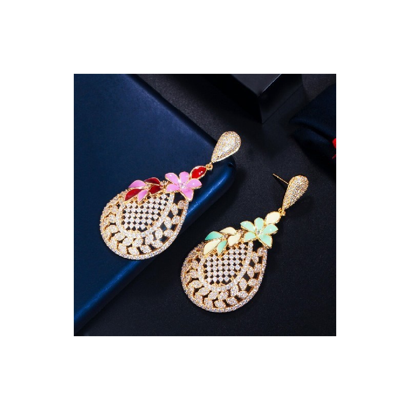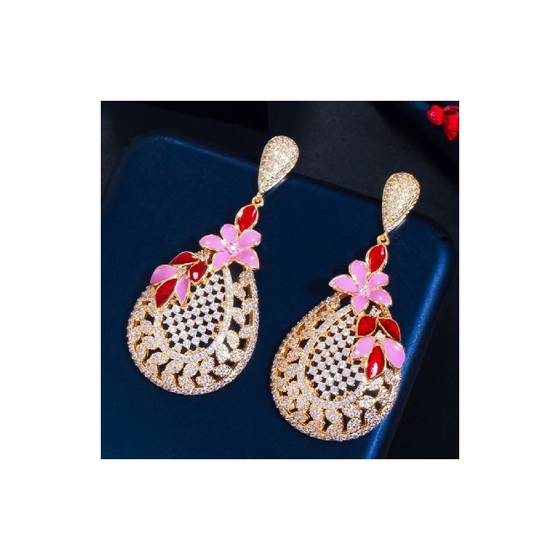 CWWZircons egyedi piros zománcozott virág levél alakú lelógó hosszú CZ fülbevaló indiai arany színű esküvői menyasszonyi parti ékszer CZ773