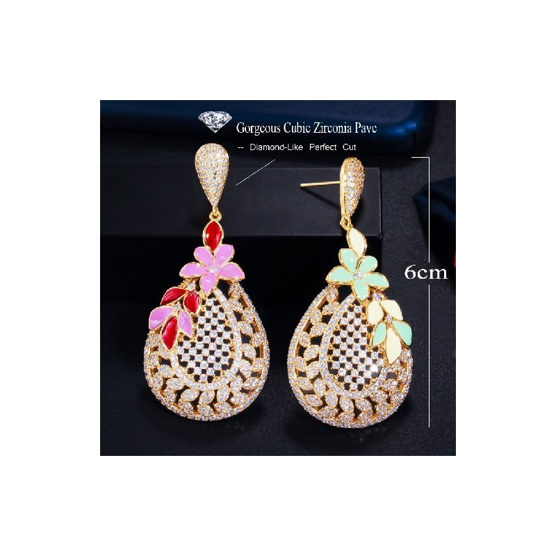 CWWZircons Unique Red Enamel Flower Leaf Shape Dangle Drop Long CZ Earrings Indian Gold Color Wedding Bridal Party Jewellery CZ773