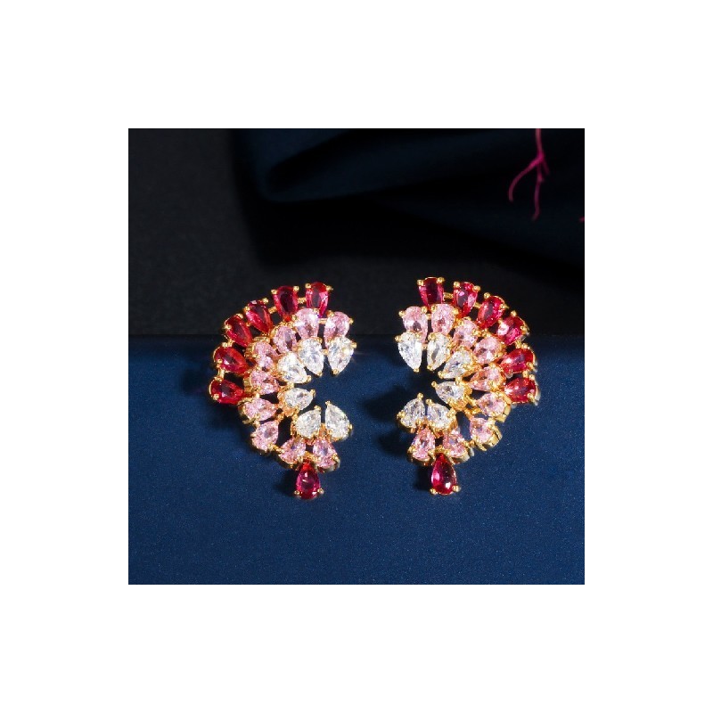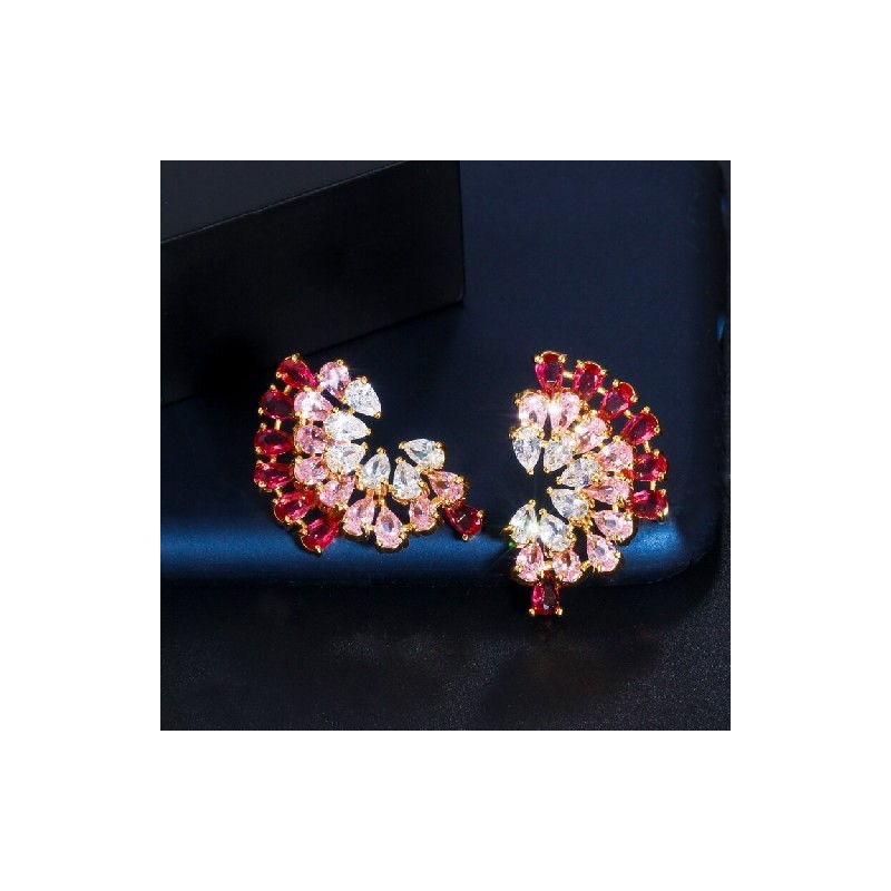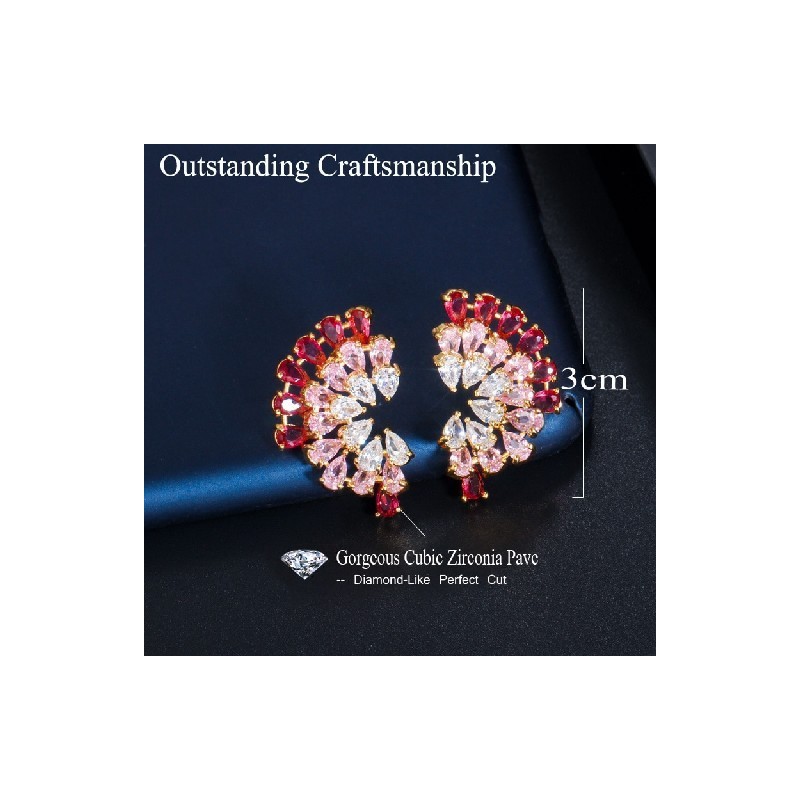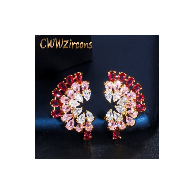 CWWZircons Cute Fancy Peacock Gradient Color Rose Red Pink Cubic Zircon Yellow Gold Color Big Stud Earrings for Women CZ704