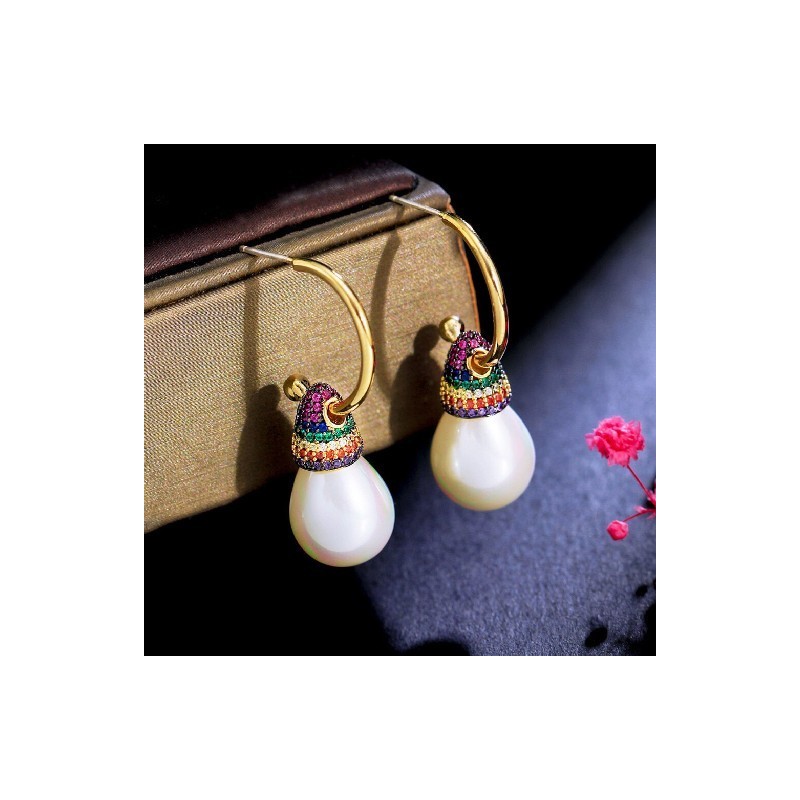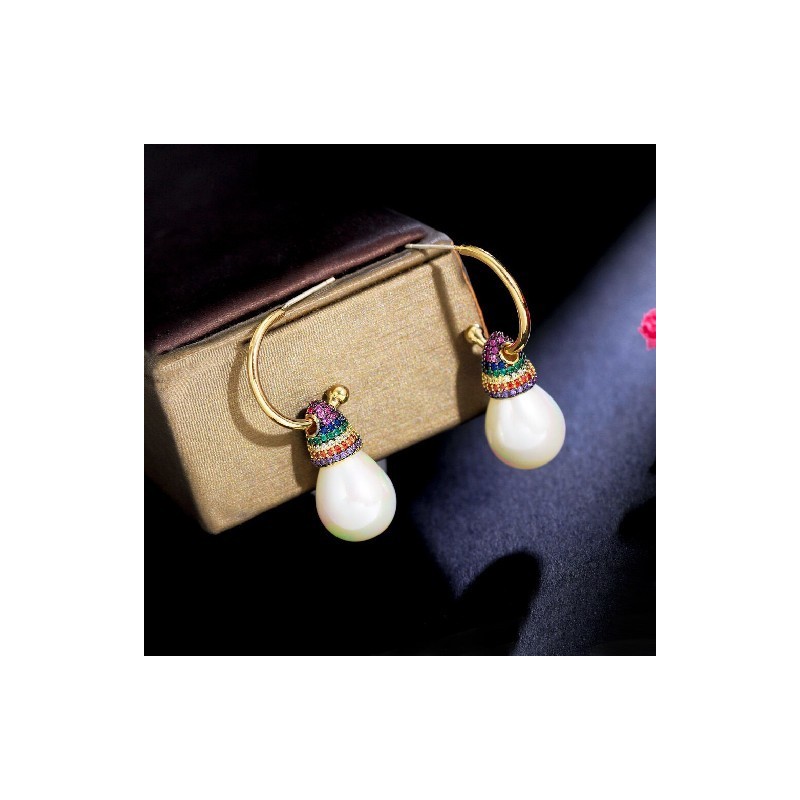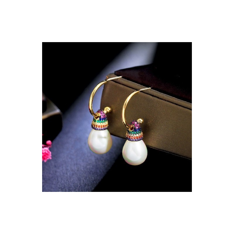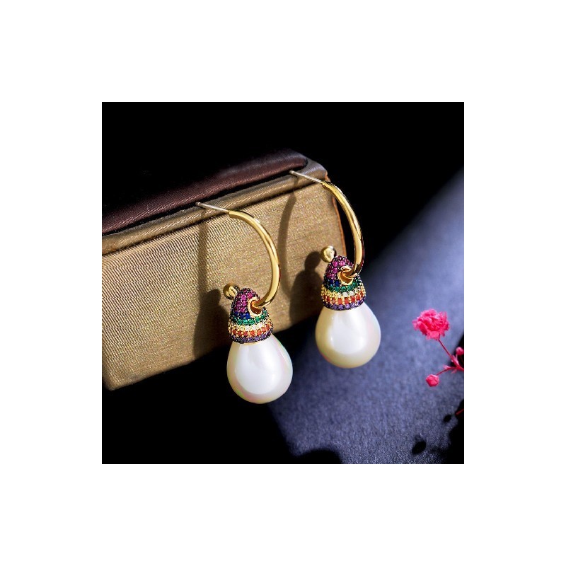 CWWZircons Unique Round Multicolor Cubic Zirconia Light Gold Plated C Shape Dangling Pearl Charm Hoop Earrings for Women CZ464