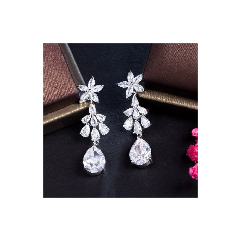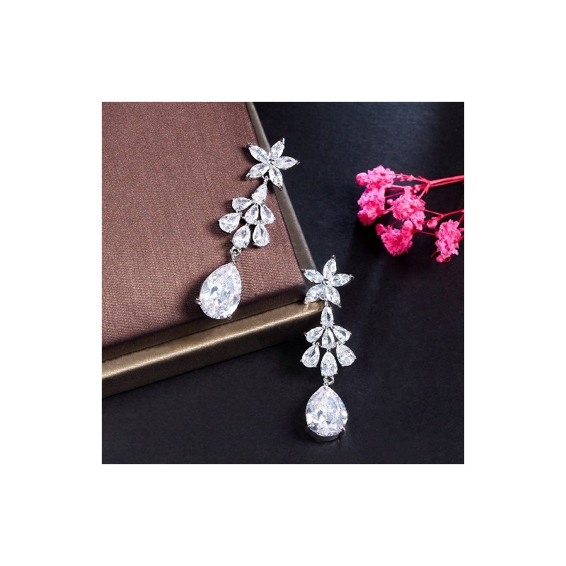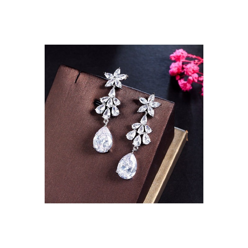 CWWZircons Sparkling White Cubic Zirconia Dangle Water Droplets Silver Plated Flower Bridal Earrings for Wedding Party CZ337