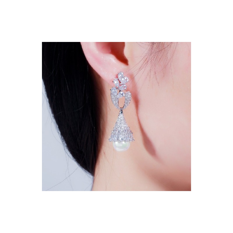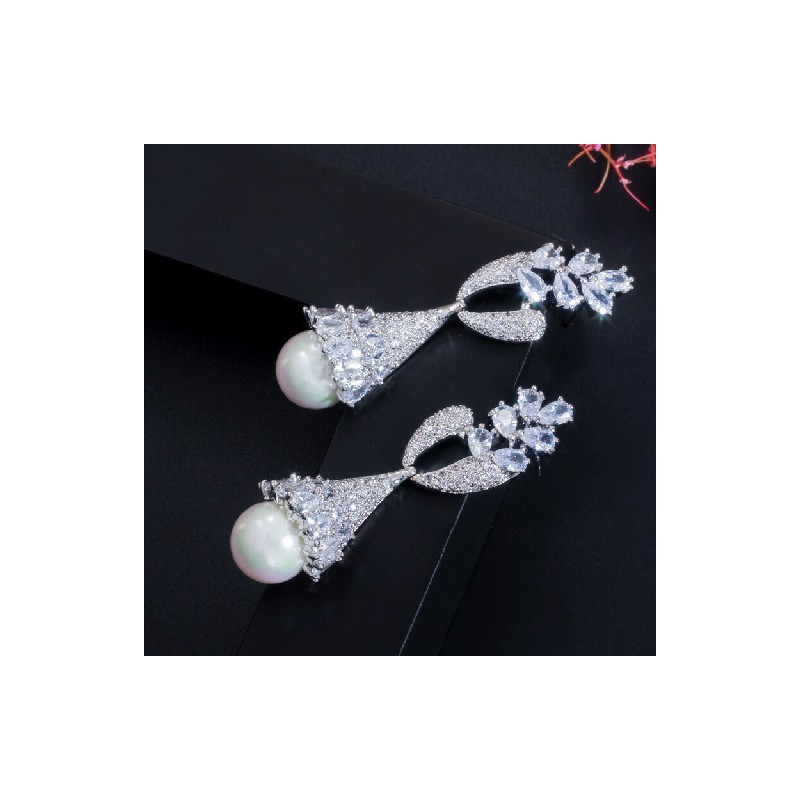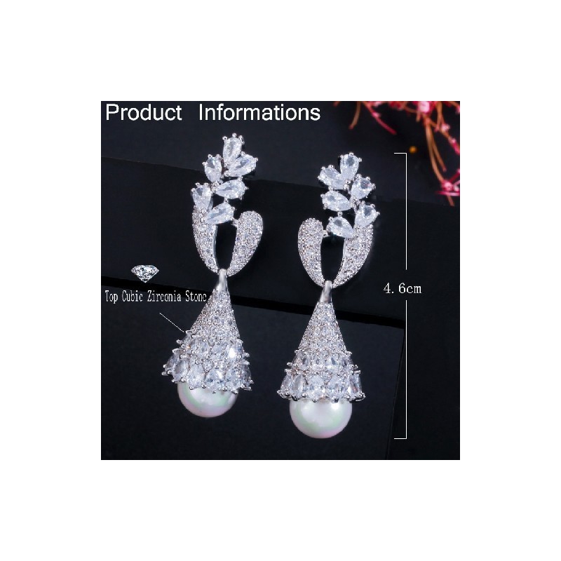CWWZircons Elegant Symmetrical Leaf Dangling Long Pearl Drop Earring for Women Trendy Cubic Zirconia Wedding Party Jewellery CZ622