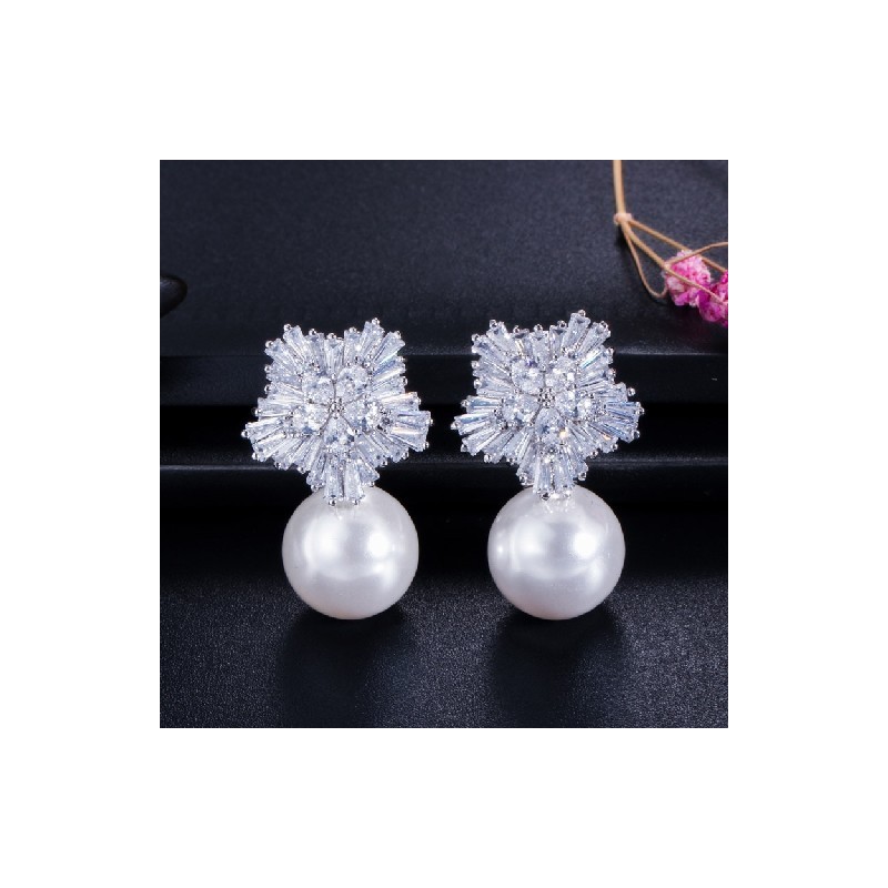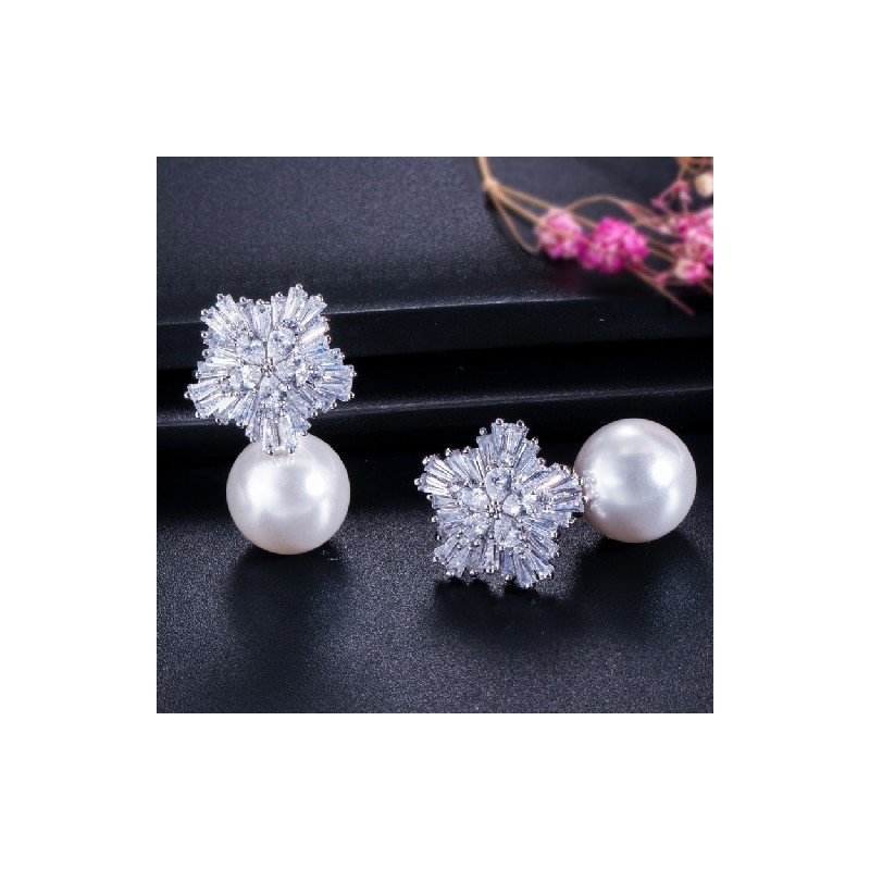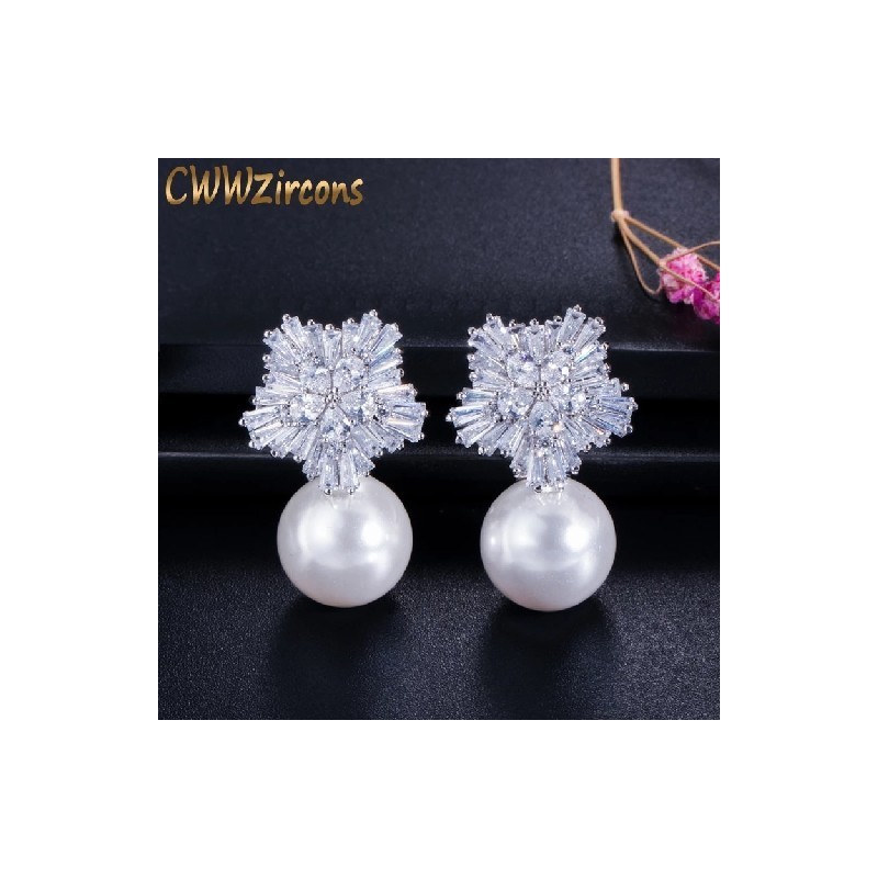 CWWZircons 2021 New Arrival Snow Flower Design Women Big Drop White Pearl Earrings with Cubic Zirconia Christmas CZ069