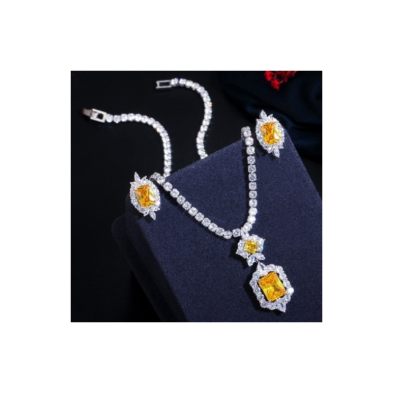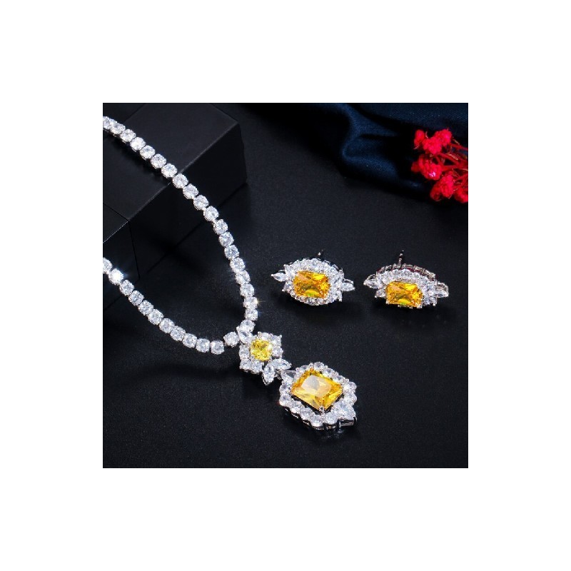 CWWZircons Shiny Yellow Cubic Zirconia Stone Round Tennis Necklace and Earrings Set for Women Party Dress Jewellery Accessory T443