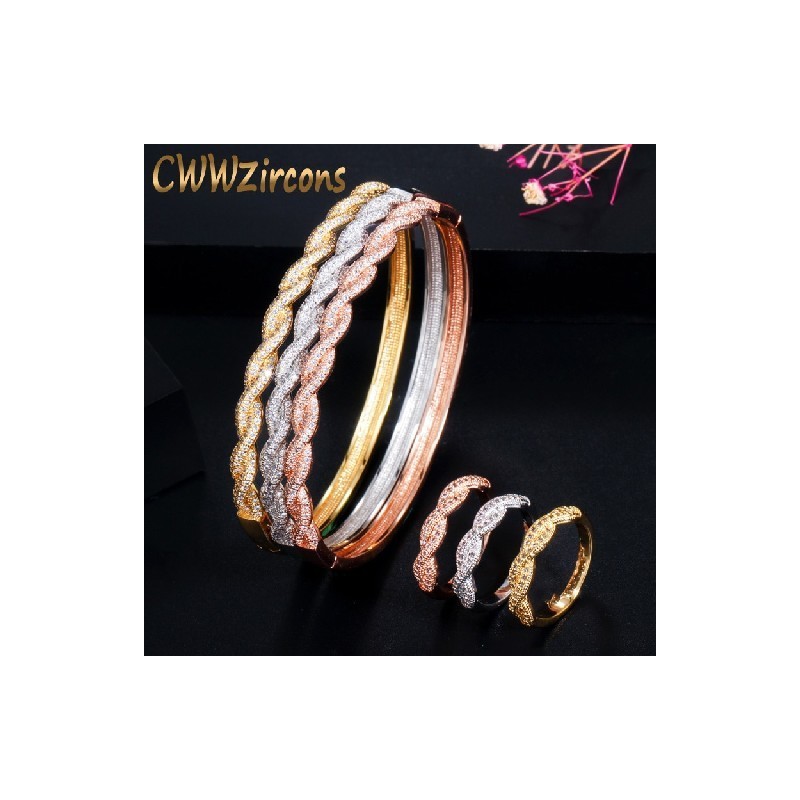 CWWZircons Twist Lines Cubic cirkónia Dubai Rose Gold színű nyitott mandzsetta menyasszonyi afrikai karkötő karkötő és gyűrű ékszer szett T458