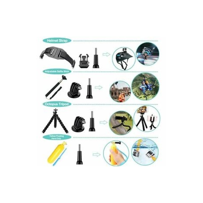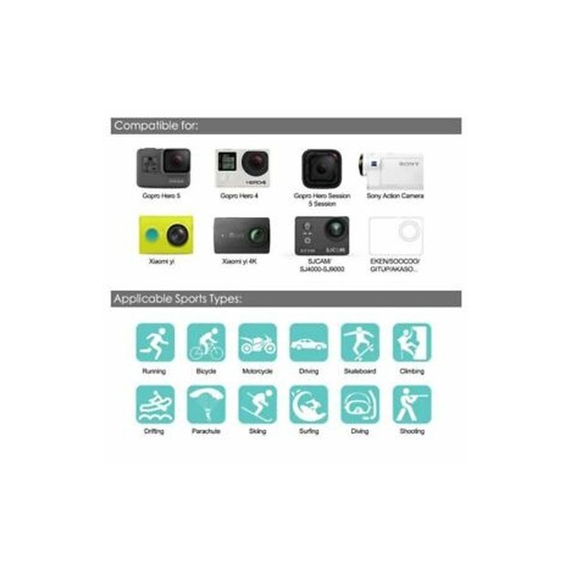 Compatible with: GoPro Hero Series Sj4000 Sj4000 plus Sj5000 Sj6000 Amkov XiaoMi Yi AMK 5000 AMK 5000S Dazzne P2 Dazzne P3 EKEN H9 FIREFLY 5S FIREFLY 6S Polaroid Cube SJ7000 SJCAM 4000 plus SJCAM 5000 plus SJCAM M10 SJCAM M10 Plus Soocoo C10 Soocoo S60 and all other action cameras