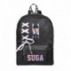 Fekete hátitáska BTS logóval, fűzővel díszítve.