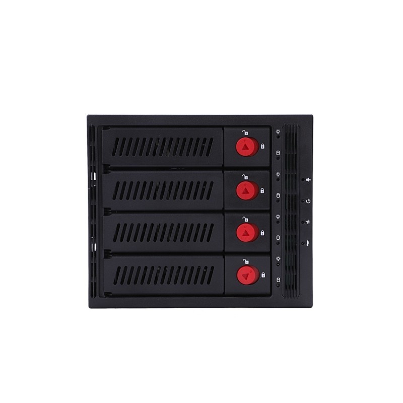 MR-6410 SATA /SAS HDD mobile rack constructs to fit 3drives within 2 x 5.25 inch drive bays. It supports 2.5 inchor 3.5 inch HDDs or SSDs up to SATA III transmission speed 6Gbps. Durable metal housing expands the lifespan, it`s simple for drive installation and maintenance. Special security tray lock prevents wrong operation. Built-in Auto-Speed Adjustable 80mm cooling fan maximizes heat dissipation. Inner Alarm and buzzer disable button. User can set the warning temperature as 60â„/45â„/buzzer disable by jumper pin easily.