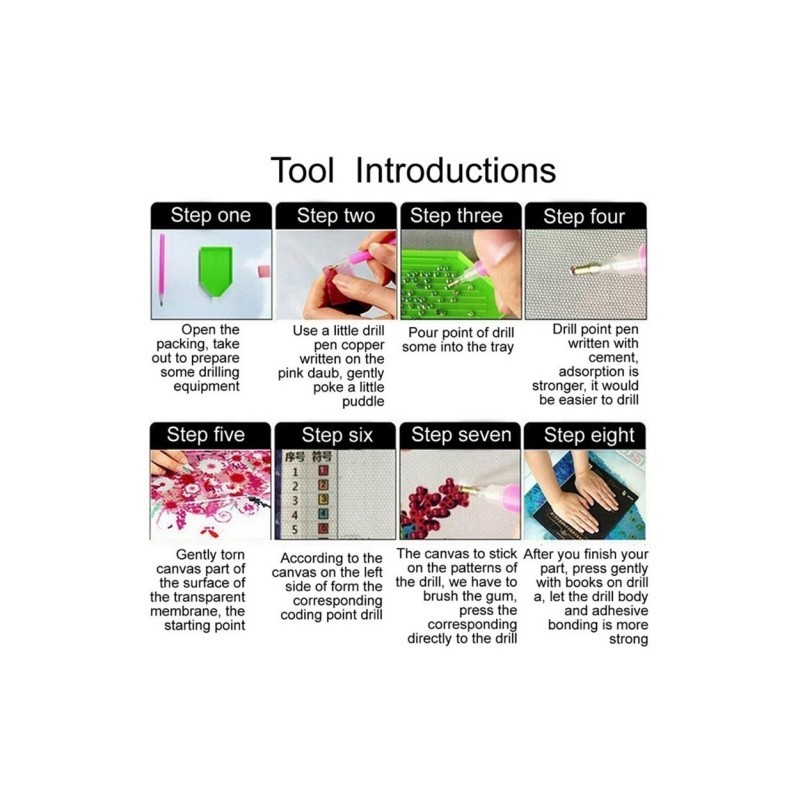 Steps:Firstly place the same beads in tray,then take the "pen" insert to the square glue lightly,leave some glue on the pen,finally pick up the bead and place it on the corresponding number on the canvas.