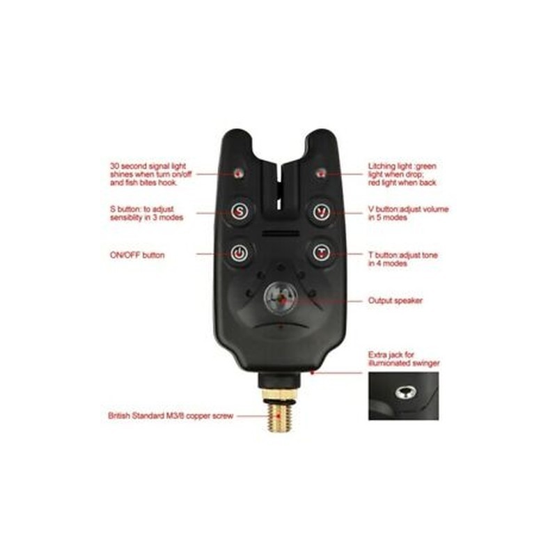 INSTALL: Alarm Dimensions are 95mm*50mm, UK standard M3/8 copper screw, fitted with 2.5mm jacks for illuminated drop off bite indicators. Please notice that it`s NORMAL if there is collision sounds in the fishing bite alarm when shaking; Because it is the product function design requirement.. ( Tips: use with could improve the fishing Bite Alarm`s signal sensitivity. )