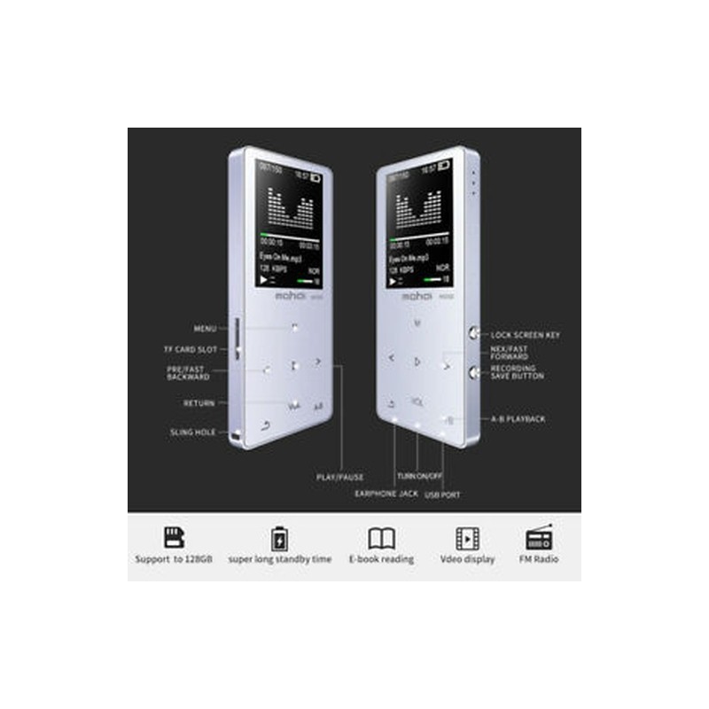 Support multi-format music play and lyrics sync; Alarm Clock / Recording / Video / FM Radio / E-book; Super long endurance time up to80 hours. Time and date setting.