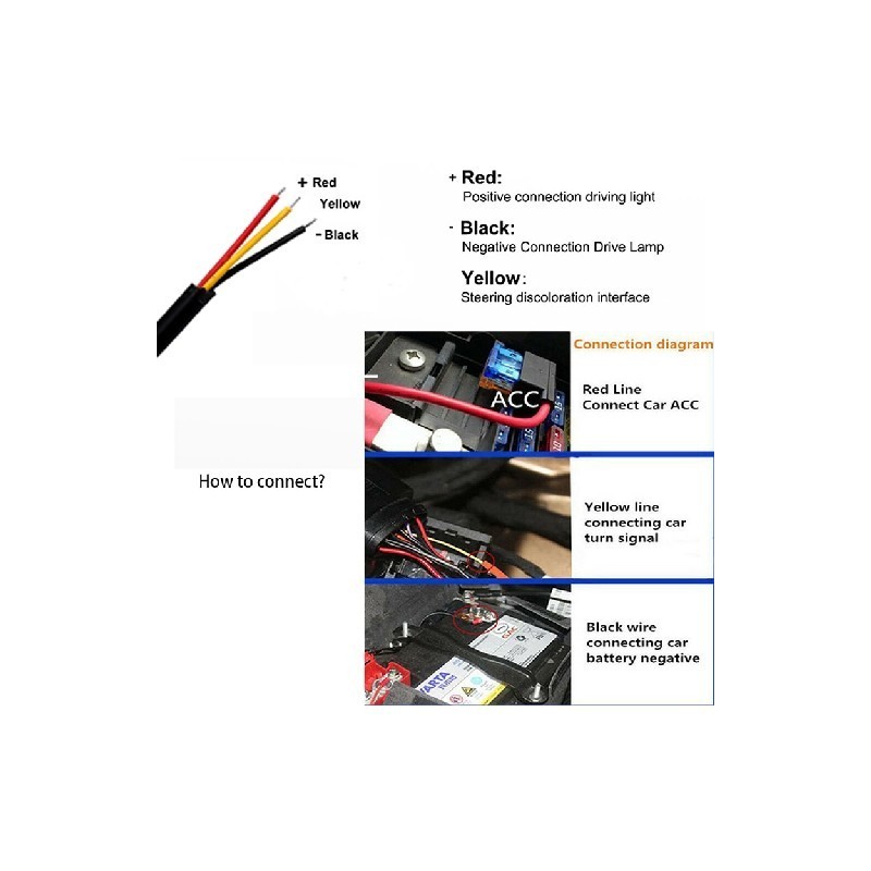 Red wire for white light , yellow wire for yellow light , black wire for negative wire.