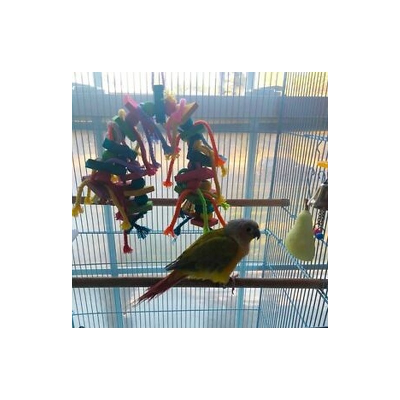 100% cotton rope knots can be untied by clever birds.Knot and Block Rainbow Chewing Hanging Toy.