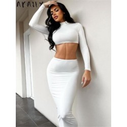 Szín: fehér S - Akaily Summer Casual 2 kétrészes szettek Női ruhák O nyakú, hosszú ujjú Crop felsők Bodycon szoknyák,
