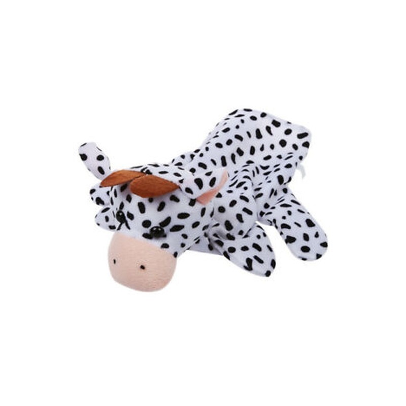 This hand finger puppet set includes a large lifelike dairy cow hand puppet and a smaller than finger puppet.