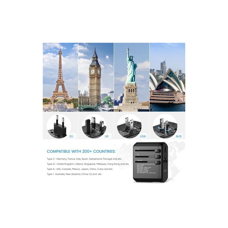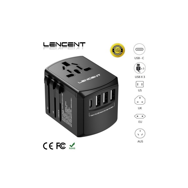 LENCENT International Travel Adapter Travel Charger with 3 USB Port and 1 Type C All-in-one Wall Charger for US EU UK AUS Travel