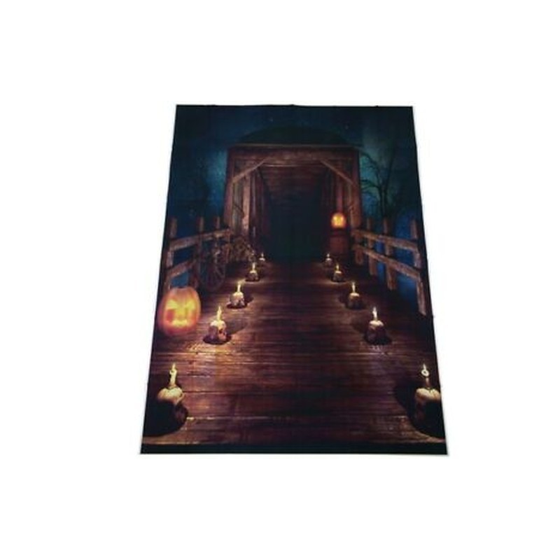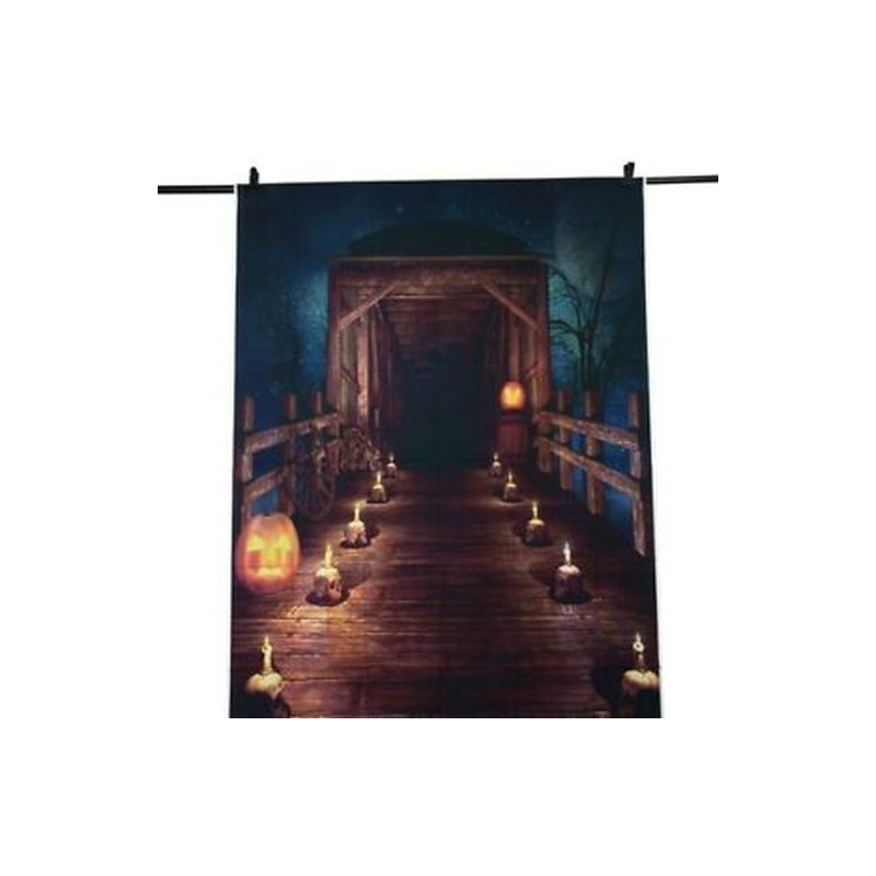 Élethű gyertyafényes, koponyás régi híd töklámpásokkal, Halloween háttér.