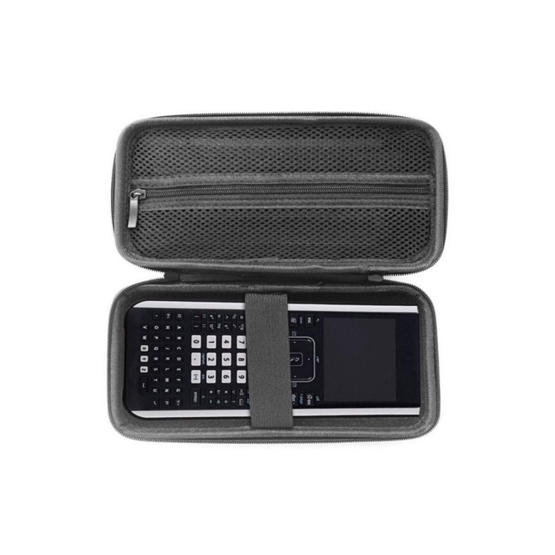 The hard zipper case has a zippered mesh pocket on the cap to secure the charging cable and adapter. The accessory kit can fit in the pocket as well. The main compartment has an elastic strap to better protect the calculator.