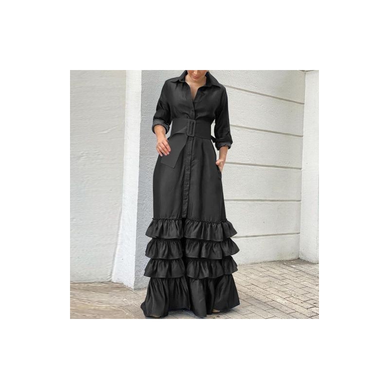 Plus 2023 Elegant Shirt Dress Autumn Women Party Maxi Dress Long Sleeve Solid Lapel Button Ruffled
