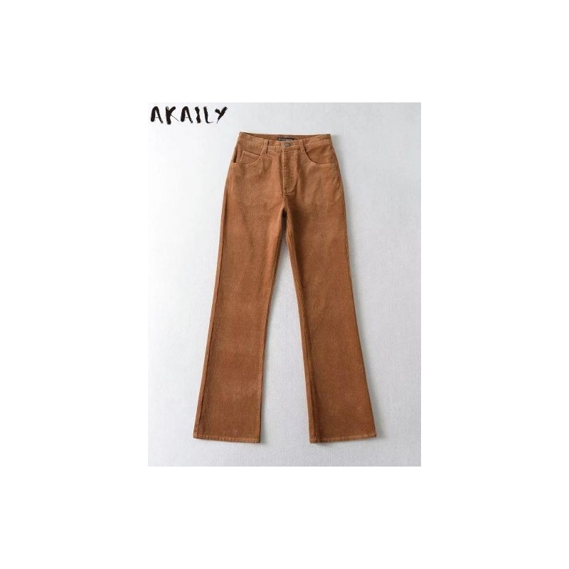 Akaily Fall Winter Brown Corduroy Pants Women Fashion 2022 High Waist Flare Baggy Pants Ladies Straight Casual Long Trousers