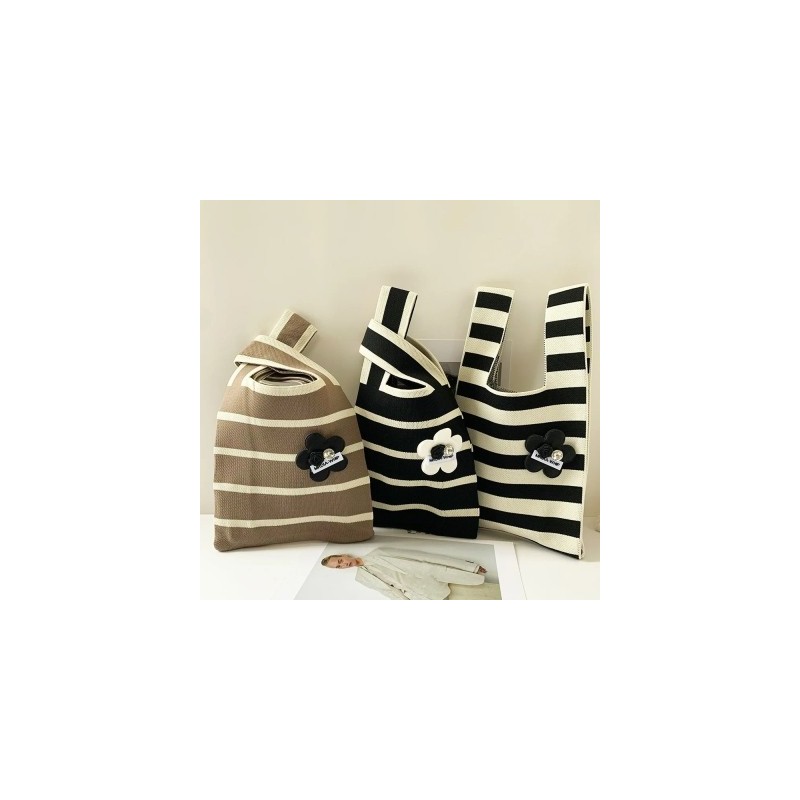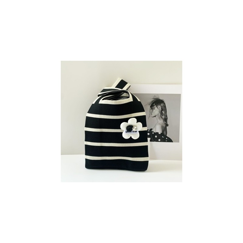 Handmade Knit Handbag Women Mini Knot Wrist-Bag Female Casual Color Wide Stripe Plaid Tote Bag With Flower Student Shopping Bag