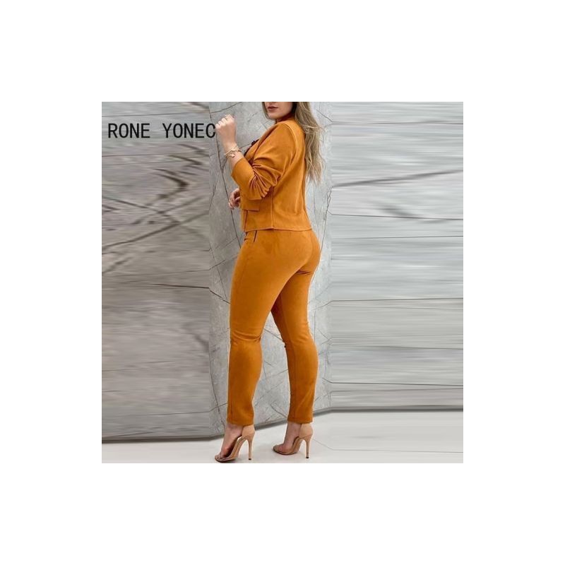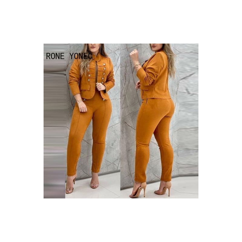 Women Solid Elegant button Stand Collar Short Tops Skinny Pencil Pants Blazer Sets