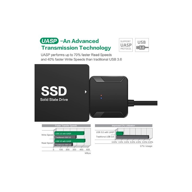 USB 3.0 to SATA transfer cable, adopts USB 3.0 high-speed transmission and is compatible with 2.0 interface.