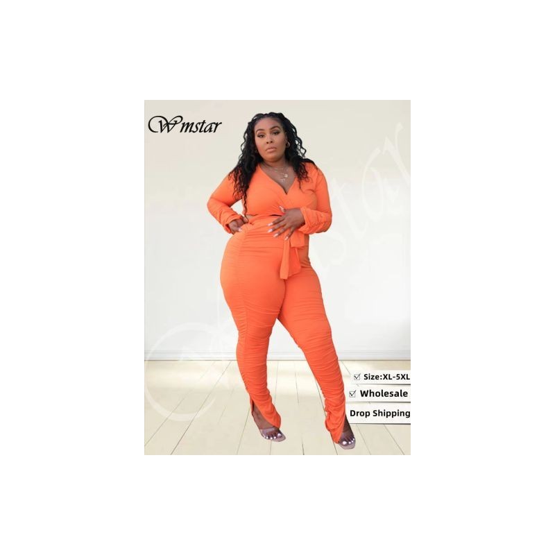 Plus Size Two Piece Outfits Women Solid Bandage Top Stacked Leggings Pants Sets Tracksuit Matching