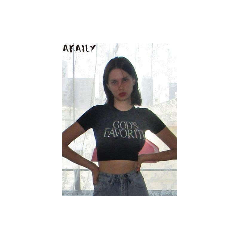 Akaily Spring Diamond Letter Print Streetwear Tops For Women 2023 O Neck Short Sleeve Crop Top Bodycon Black Tee Shirts Female