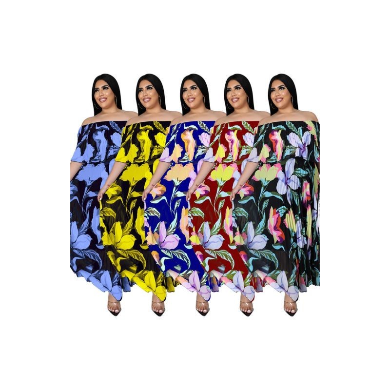 Plus Size Dress Women 5xl Off Shoulder Flower Print Elastic Waist Party Pleated Maxi Dress Summer