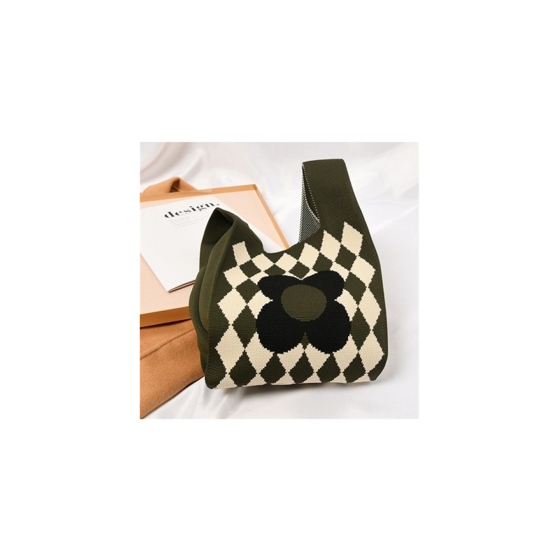 Geometric Flower Knit Handbag Women Korean Casual Plaid Wrist Bag Foldable Eco Shopping Bag Reusable Grocery Storage Tote Bag