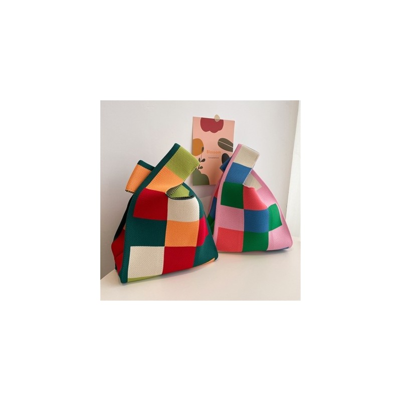 Kockás színű kézzel készített kötött kézitáska koreai női szőtt csuklótáska Környezetbarát strandtáska diák újrahasználható bevásárlótáskák