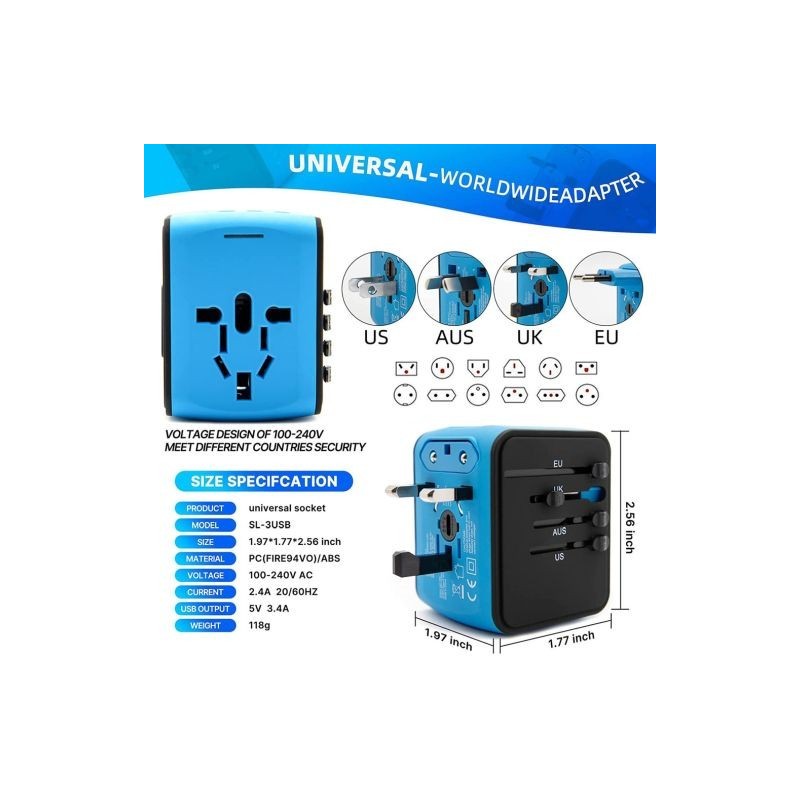 1. Practicality: Covering more than 190 countries or regions. It features US (Type A/B), EU (Type C/F), UK (Type G), AUS (Type I) plugs, universal AC outlet and 4 USB charging. It is available in the US, Canada, UK, Europe, China, Japan and almost anywhere in the world.