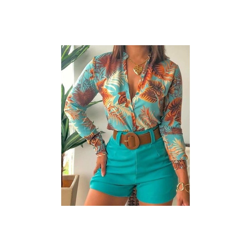 Two Piece Set Women Elegant Fashion Print Crop Top Shorts Long Sleeve Shirts Matching Set Fall Clothes Wholesale Dropshipping