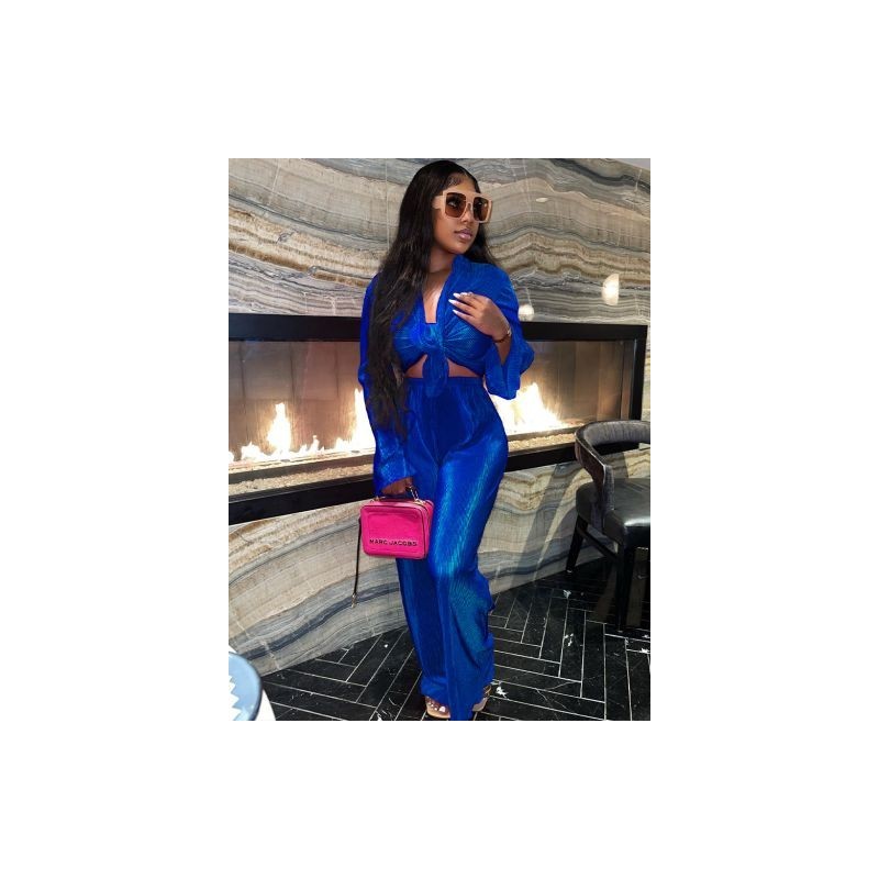 Őszi téli női ing redőzött kétrészes készletek tömör laza birodalmi derekú egyenes nadrág pulóverek irodai női tréningruhák