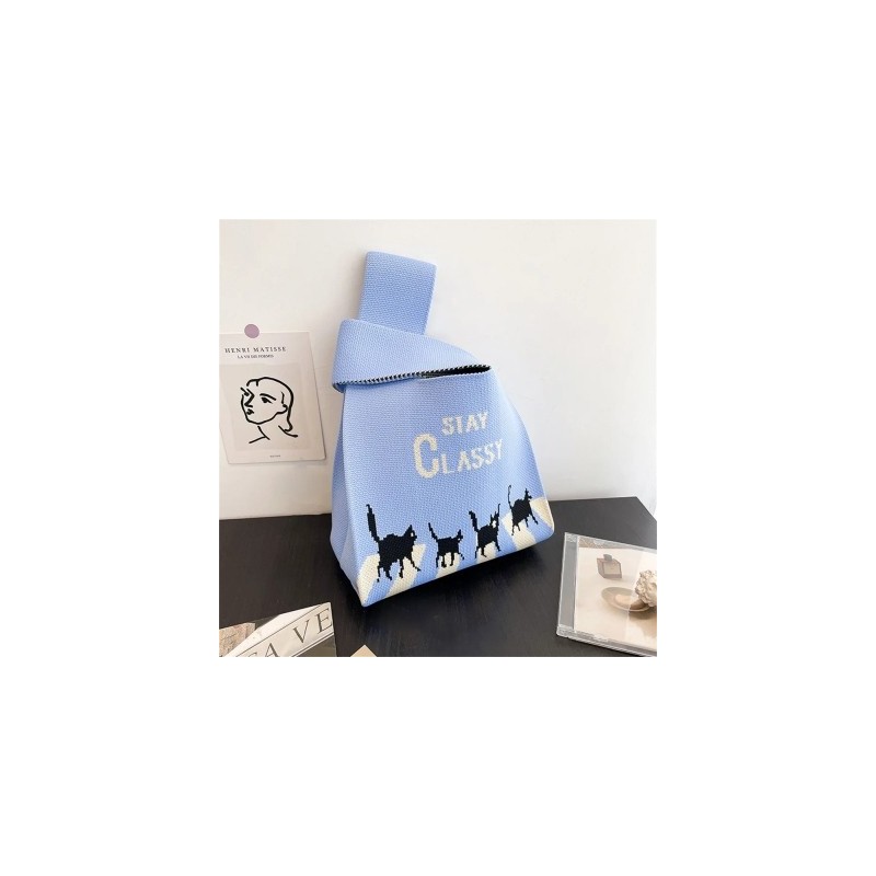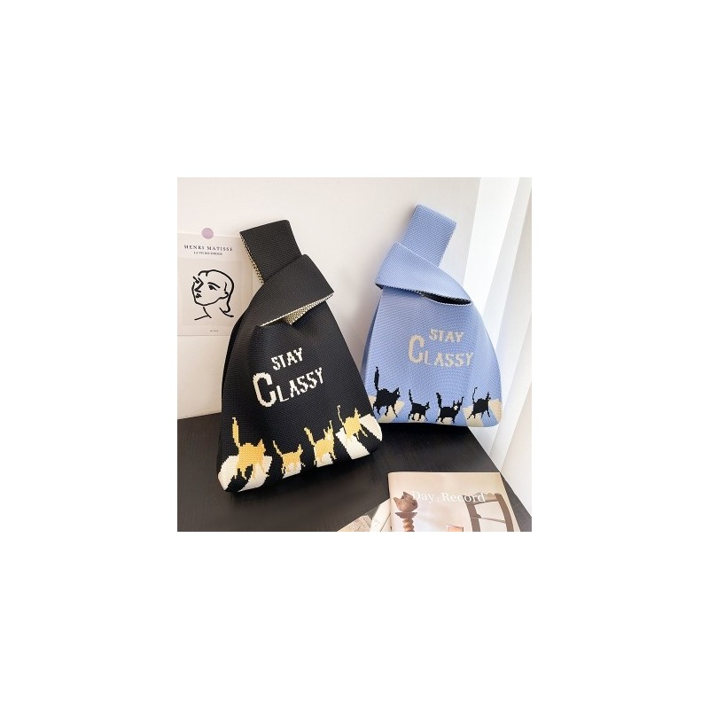 Cat Letter Vest Bag Knitted Handbag Japanese Style Portable Knot Wrist Bag Women Top Handle Tote Bag Simple Purses Phone Pouch