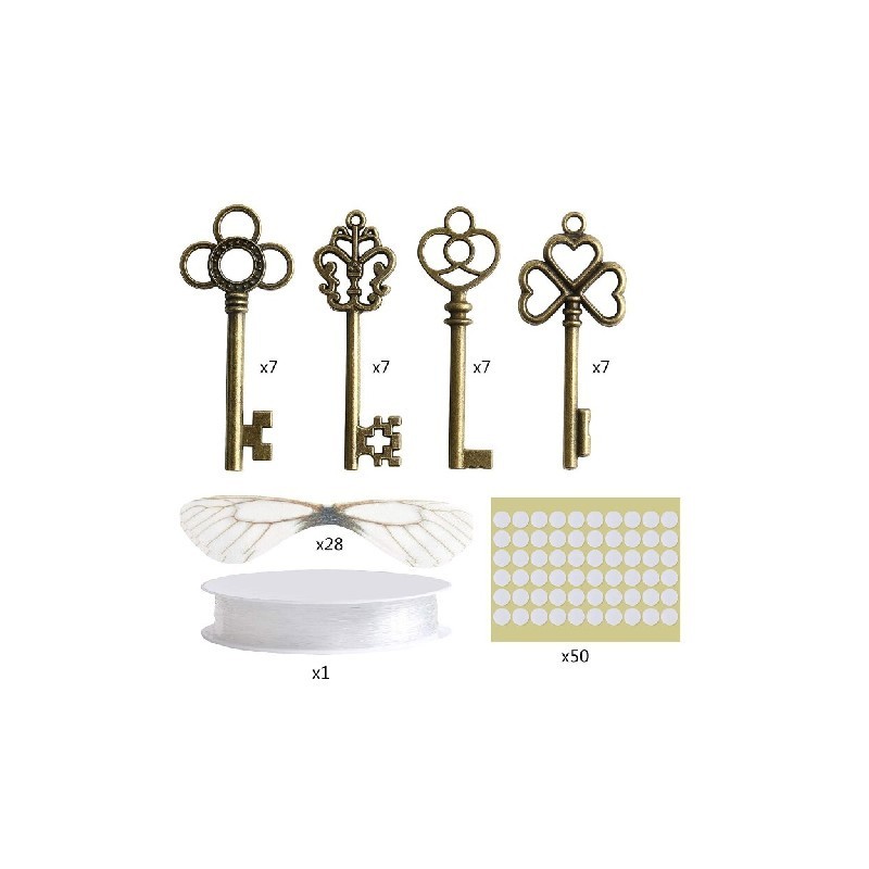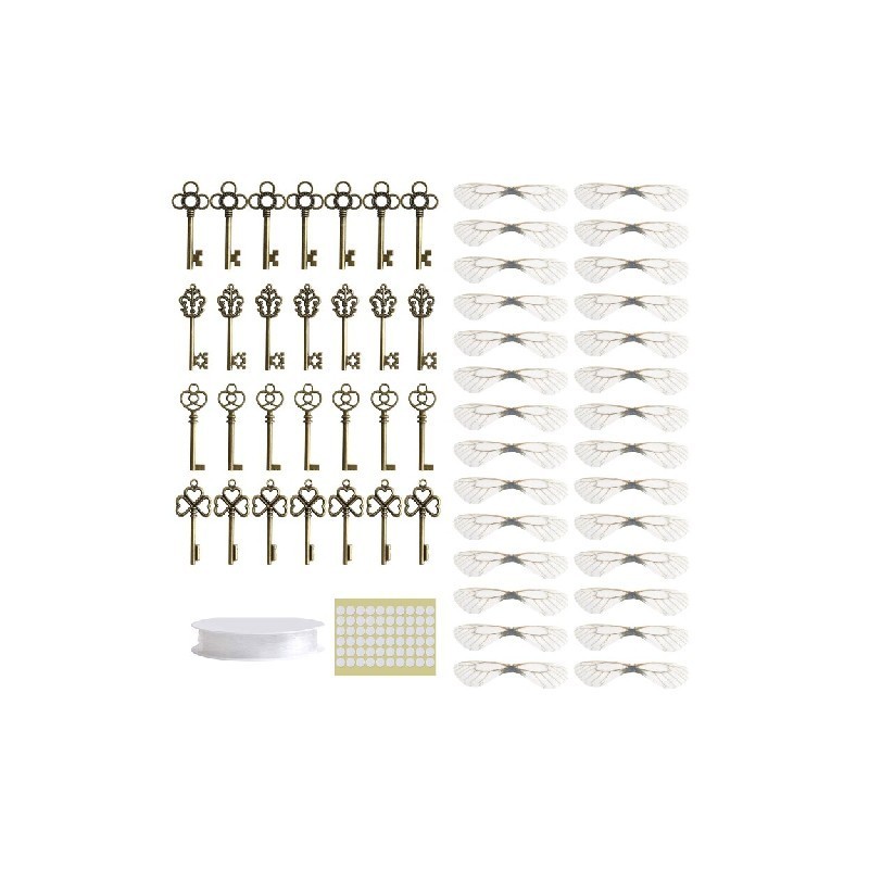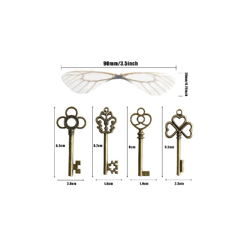 Package: Magic themed flying keys DIY set include 28x vintage keys, 28x dragonfly wings, 50x double sided sticky, enough quantity to use.