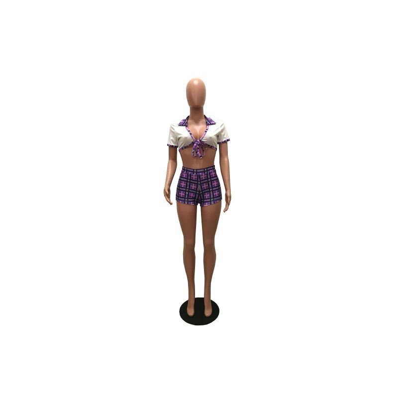 Preppy Style Plaid Spliced Two Piece Shorts Sets Girls Short Sleeve Cleavage Crop Top and Biker Short College Korean Club Outfit