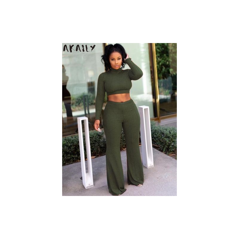 Akaily Fall Winter Orange Knitted 2 Two Piece Sets Women Outfit 2022 Long Sleeve Sweater And Flare Pants Sets Female Streetwear