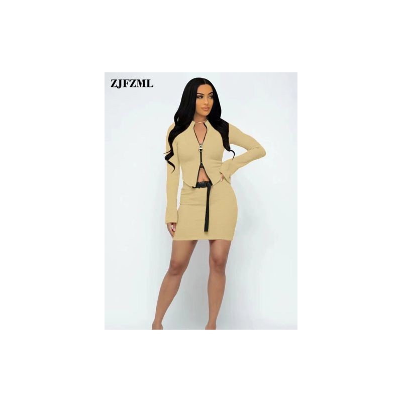 Stunning Elastic 2 Piece Sets Womens Outfits Zipper Front Split Flare Sleeve Crop Top High Waist Sheath Mini Skirt Streetwear