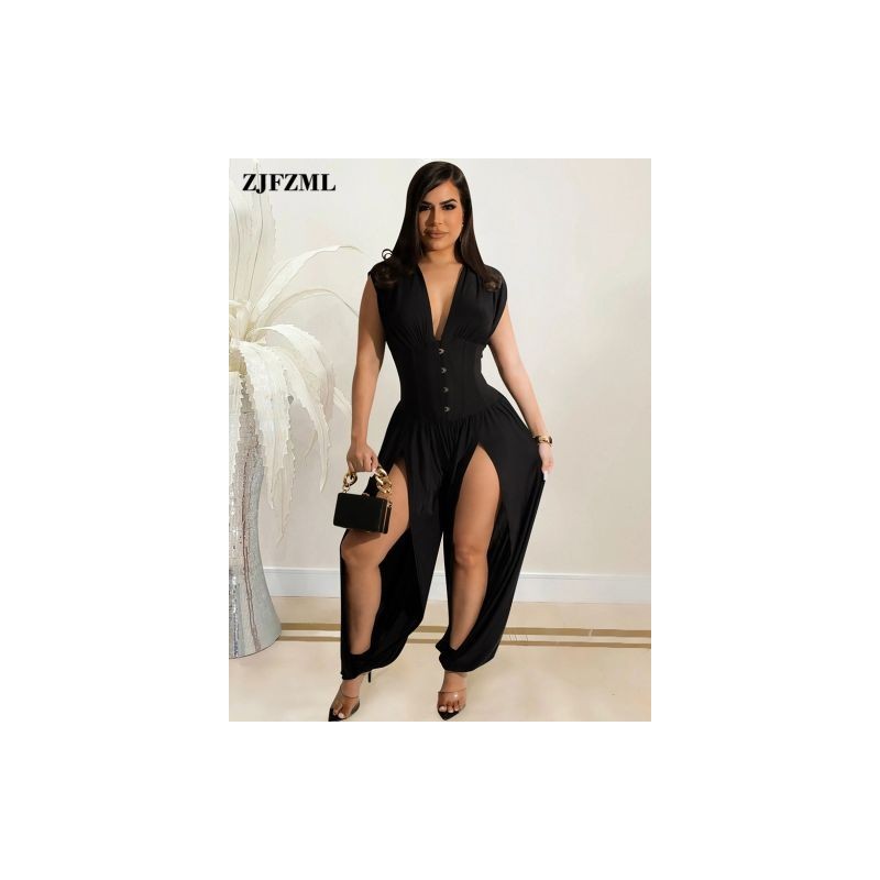 Derék formájú, karcsú nadrágtartó női jumpsuit, egyszerű lehajtható gallérral, ujjatlan egyrészes teljes nyári elülső magasan osztott body