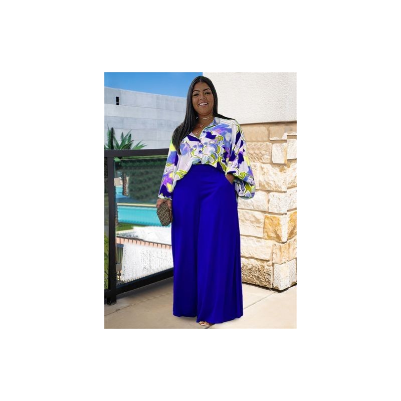 Plus Size Two Piece Set Women 2022 Print Shirts Tops and Pants Pockets Wide Leg Fall Fashion Matching Suit